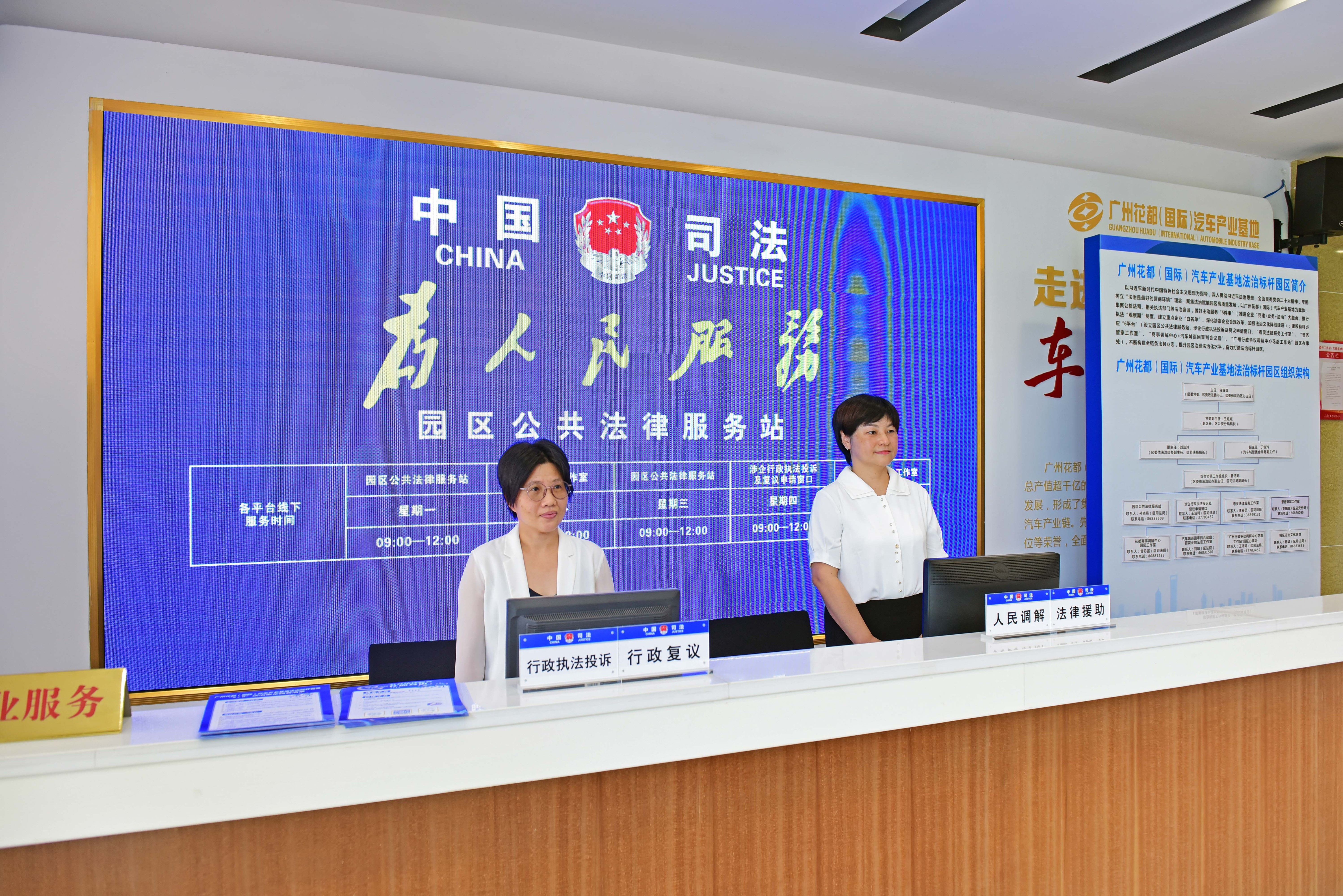 在护航产业发展方面,花都区创新打造“惠企5+6”法治标杆园区,在广州花都(国际)汽车产业基地落地运行。该园区集聚公检法司等法治资源,提供“一站式”法律服务、多元纠纷调解等特色服务,为企业发展全程护航,其经验做法获评广州市首届营商环境改革十大最佳实践,入选省发改委案例,并被中央政法委、《人民日报》《法治日报》等各级媒体推广。区法院与区空港委联合设立空港合议庭,创新工作方法精准化解涉企纠纷;区检察院打造“红棉花检e站”,38个便民联络站形成服务矩阵,获评全省检察机关党建与业务深度融合优秀事例,共同为区域经济高质量发展营造稳定、公平、透明的法治环境。