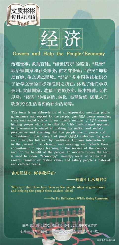 治理世事,救助百姓。“经世济民”的略语。“经世”即治理国家和社会事务,使之有条理;“济民”即帮助百姓,使之远离困境。“经济”是中国传统知识分子治学立世的目标和准则之所在,体现了他们学以致用、贡献国家、造福百姓的务实、民本精神。近代以降,“经济”转指创造、转化、实现价值,满足人们物质文化生活需要的社会活动等。