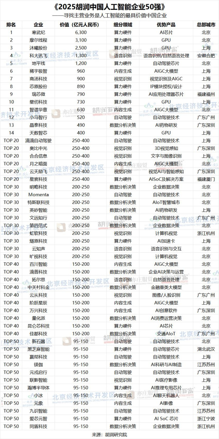 “本次榜单聚焦于专门从事AI领域的公司。AI芯片上榜企业最多,而AI算力基础设施还包括AI服务器、AI数据中心等。不过,以AI服务器、AI数据中心等为主营业务且企业价值达到门槛的,暂时没有。比如浪潮信息,虽然是国内AI服务器龙头,但没有证据显示其AI服务器占比已经超过传统服务器。再比如润泽科技,虽然是国内智算中心龙头企业,但其AIDC业务约为普通IDC的一半,因此不视为主营人工智能的企业。同时,DeepSeek由于明确以基础研究和开源为主要方向,尚未将商业化作为核心目标,因此未被纳入本次榜单的评估范围,虽然截至2025年9月,其移动端月活跃用户规模已达1.45亿。另外,还有许多综合实力雄厚的企业,例如拥有盘古大模型的华为、拥有豆包大模型的字节跳动以及拥有混元大模型的腾讯,这些公司在资源投入、人才技术、算法基础等方面拥有更为坚实的基础,它们在AI领域的发展潜力和影响力同样值得关注。”