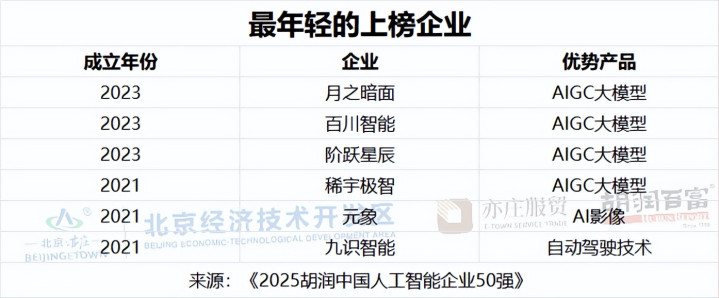 “AI企业都普遍年轻,上榜企业平均成立于12年前。成立于2021年以后的上榜企业有6家,分别是月之暗面、百川智能、阶跃星辰、稀宇极智、元象、九识智能。其中,前四者均为大模型企业。”