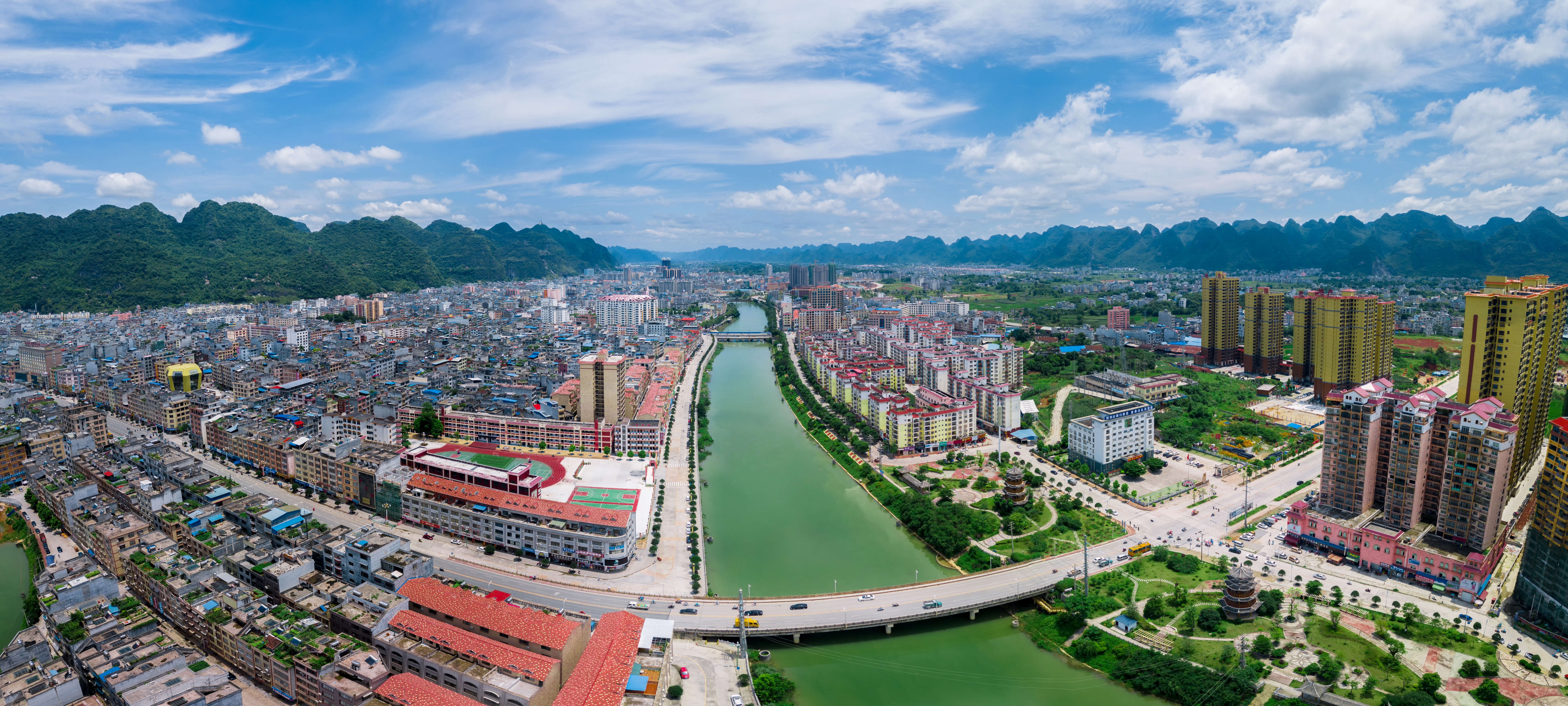 航拍都安瑶族自治县县城景观。