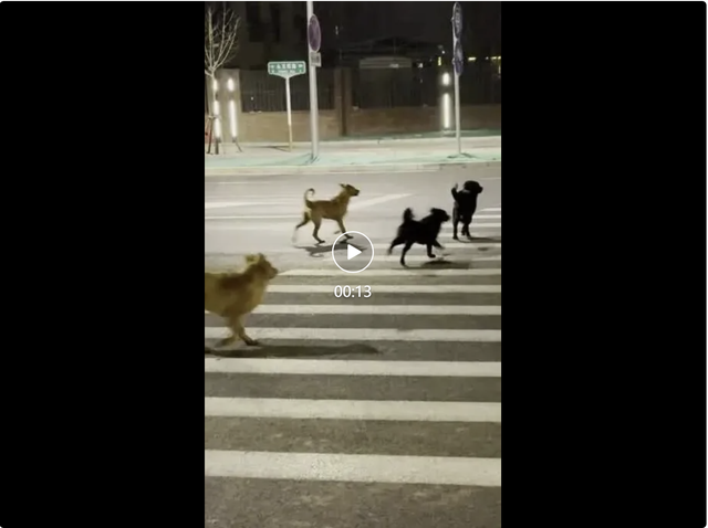王先生本人也多次遭遇这些流浪狗。他拍摄的另一段视频显示,自己从该拐角走过时曾被两拨狗夹在中间,“我每天都会被流浪狗影响。”